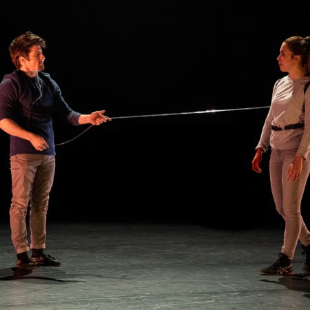 Quatre éléments, deux acrobates, un mât chinois et un outil de survie, inerte, un concentrateur d’oxygène. Invisible, pourtant partout dans l’air, l’oxygène, manque dans le corps de Jesse. Ces dernières années, sa santé s’est détériorée et il est à présent dépendant d’un concentrateur d’oxygène. Sa maladie devient un bagage, une limitation. Là où son corps impose les limites, Rocio est présente pour le suppléer. « À 2 mètres est un spectacle dans lequel je prends appuis sur mes proches en échange d’une partie de moi. Une partie de mon poids est délestée par ma partenaire, Rocio, qui assure la continuité de la narration en allant jusqu’à porter mon oxygène. M’accompagnant physiquement, mentalement et émotionnellement, elle est la clé de voûte de ce récit. Nous sommes ensemble pour partager le poids de cette histoire. Vouloir donner au public la force et l’inspiration de lutter contre les tracas du quotidien. Ouvrir les regards sur le monde des possibles afin de se donner les moyens d’aller au-delà de nos limites. » Jesse Huygh. Malgré sa mucoviscidose diagnostiquée à 12 ans, Jesse Huygh a toujours été sportif : gymnaste au niveau national, il se formera ensuite à l’Esac. Il allie aujourd’hui création et pédagogie. Née à Bahia Blanca, en Argentine, Rocio Garrote est également diplômée de l’Esac. Elle travaille notamment avec la Compagnie de danse TerazNow [Belgique] et la Compagnie de Cirque & de Danse Hurjaruuth [Finlande].
