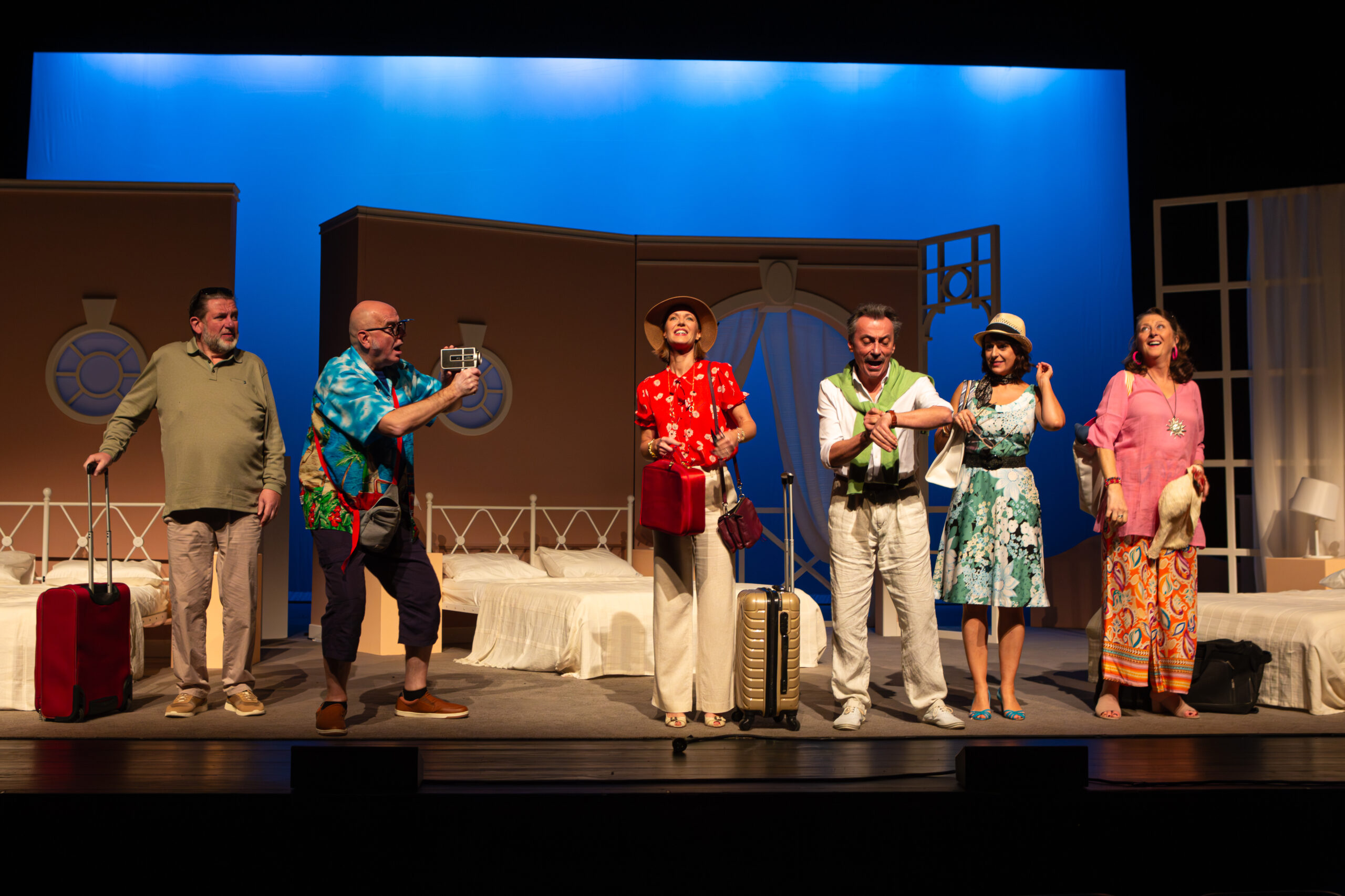 Premier jour des vacances. Chaque couple s’installe dans sa chambre. D’emblée le ton est donné et le public peut directement cerner le profil de chaque personnage. D’abord, il y a Luc (Daniel Hanssens) et Véronique (Christel Pédrinelli). Leur chambre, ou plutôt leur “trou à rats”, ne leur plaît pas ; ils en changeraient bien. Après tout, ils ont payé le même prix que les autres. Ensuite, il y a Alain (Michel Hinderyckx) et Mireille (Catherine Claeys). Si Alain semble calme et détendu, Mireille, elle, veille à l’intendance et à la gestion de “la caisse commune” pour les dépenses de chacun. Enfin, Xavier (Pierre Pigeolet) et Martine (Joséphine de Renesse), style bobo, s’inquiètent de