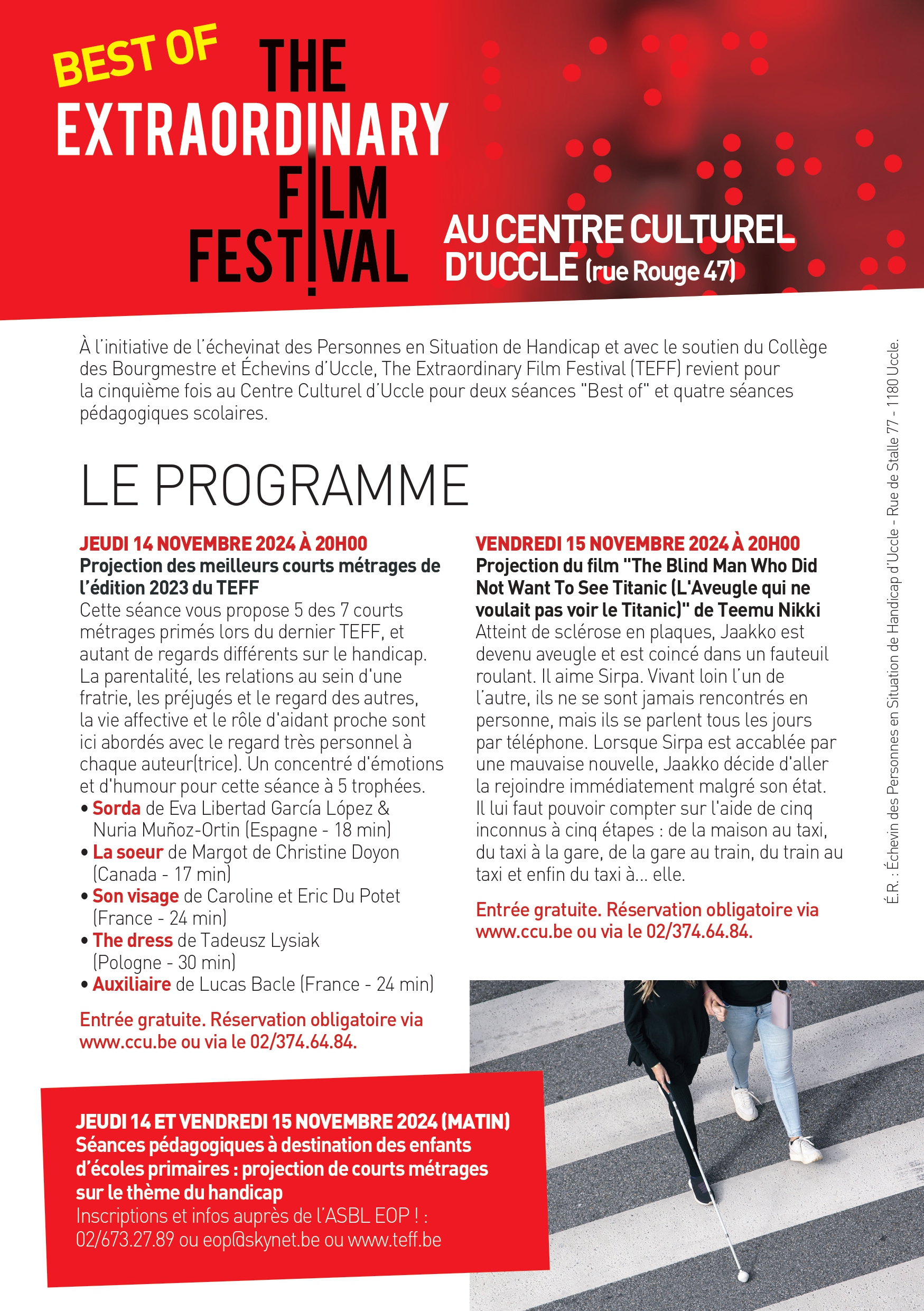 À l’initiative de l’échevinat des Personnes en Situation de Handicap et avec le soutien du Collège des Bourgmestre et Échevins d’Uccle, The Extraordinary Film Festival (TEFF) revient pour la cinquième fois au Centre Culturel d’Uccle pour deux séances “Best of” et quatre séances pédagogiques scolaires.