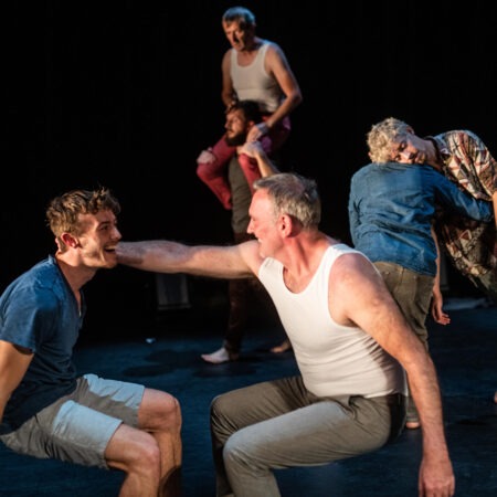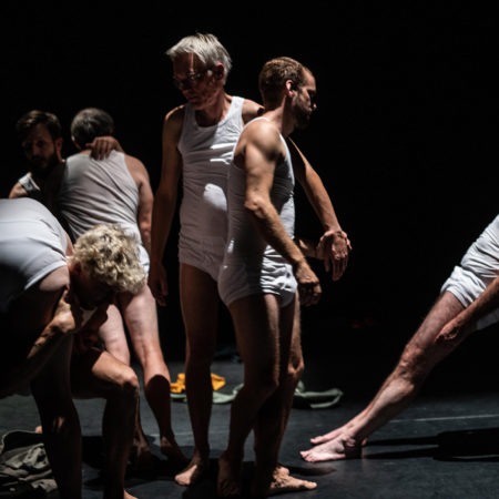 Quatre artistes de cirque se produisent sur scène avec leur père. Carrying my father est une performance physique et acrobatique sur le fait de porter et d’être porté, de savoir tenir autant que de savoir lâcher prise. Le spectacle se tient sur le fil de la conscience qu’un jour, le fils portera son père, comme le père a autrefois porté son fils. Au début, on entend des voix. Puis, des silhouettes traversent la scène deux par deux, s’immobilisent, se rapprochent les unes des autres, prennent de la distance, repartent. Les textes s’arrêtent, la scène s’éclaire, les quatre duos se rencontrent, se saluent, un peu maladroitement. There There Company offre un spectacle acrobatique tendre, sans mécanique corporelle et rempli d’émotion. Huit hommes, pères et fils ensemble, se testent, se soulèvent et se rencontrent de manière inattendue. C’est la beauté de l’imperfection, dans la force et la rivalité. Huit corps, pas tous aussi forts, mais puissants dans leur individualité et leur interaction. Ils découvrent les défis liés au vieillissement et la richesse de l’entraide.
