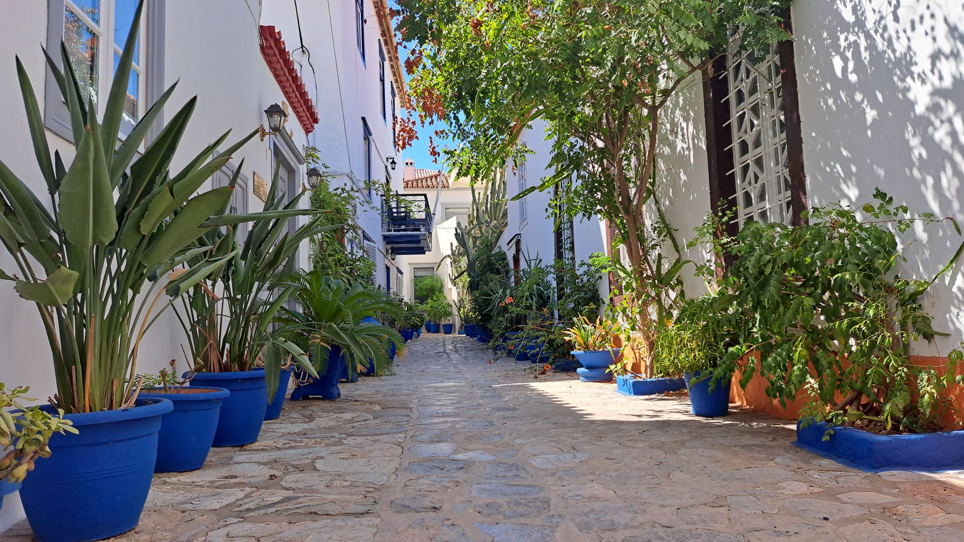 On y découvre également le pavage à la spetsiote, réalisé avec des galets noirs et blancs et dessinant des motifs inspirés de la mer ou de l’histoire militaire de l’île.