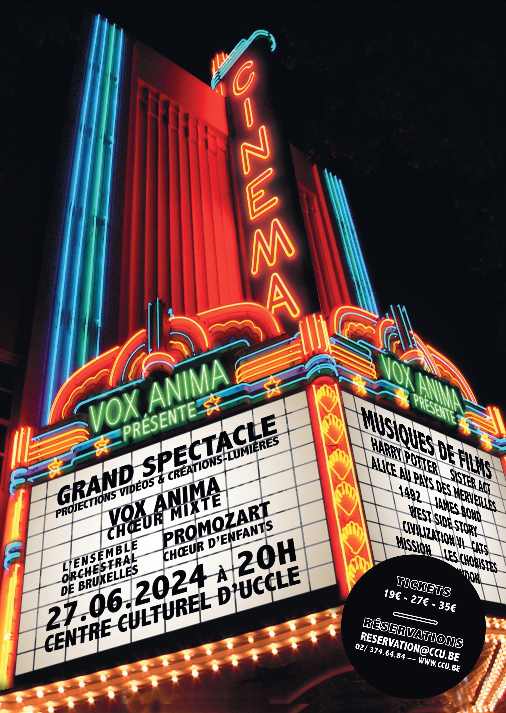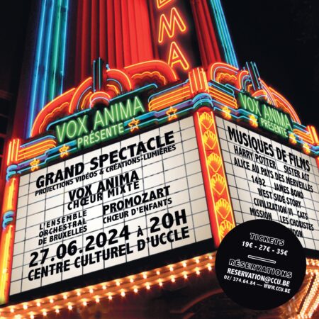 C’est précisément à un beau voyage au cÅ“ur du grand écran que vous invite le choeur mixte Vox Anima. Un spectacle d’1h45 au cÅ“ur des plus beaux thèmes de film, rehaussé par la participation de l’Ensemble Orchestral de Bruxelles et d’un chÅ“ur d’enfants issu de l’ASBL Promozart.