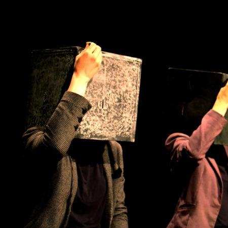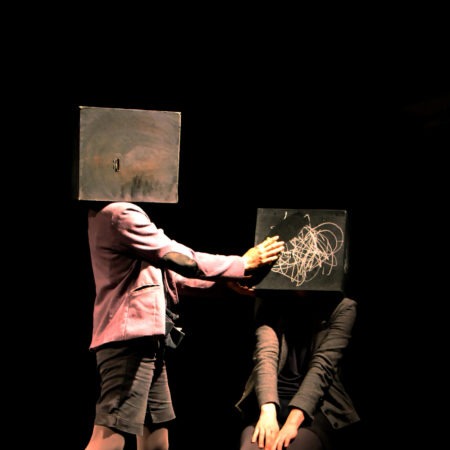Face à face, deux drôles de silhouettes s’observent. La tête emboîtée dans des cubes noirs, elles font défiler sous leur craie un ciel étoilé, une ville en noir et blanc, un oiseau coloré ou des visages aux multiples émotions. Ces cubes noirs sont utilisés pour refléter les humeurs, les expressions. L’image et le geste remplacent la parole et évoquent les relations humaines. Les boîtes noires racontent autant nos multiplicités et nos différentes facettes, que nos egos absurdes, ceux-là mêmes qui enferment et génèrent des masques sociaux. Entre jeu masqué et théâtre d’objets, c’est toute une histoire qui se dessine, se devine et parfois s’efface, pour mieux s’inventer. Un voyage surréaliste, graphique et poétique pour les petits, et un enchantement pour les grands.