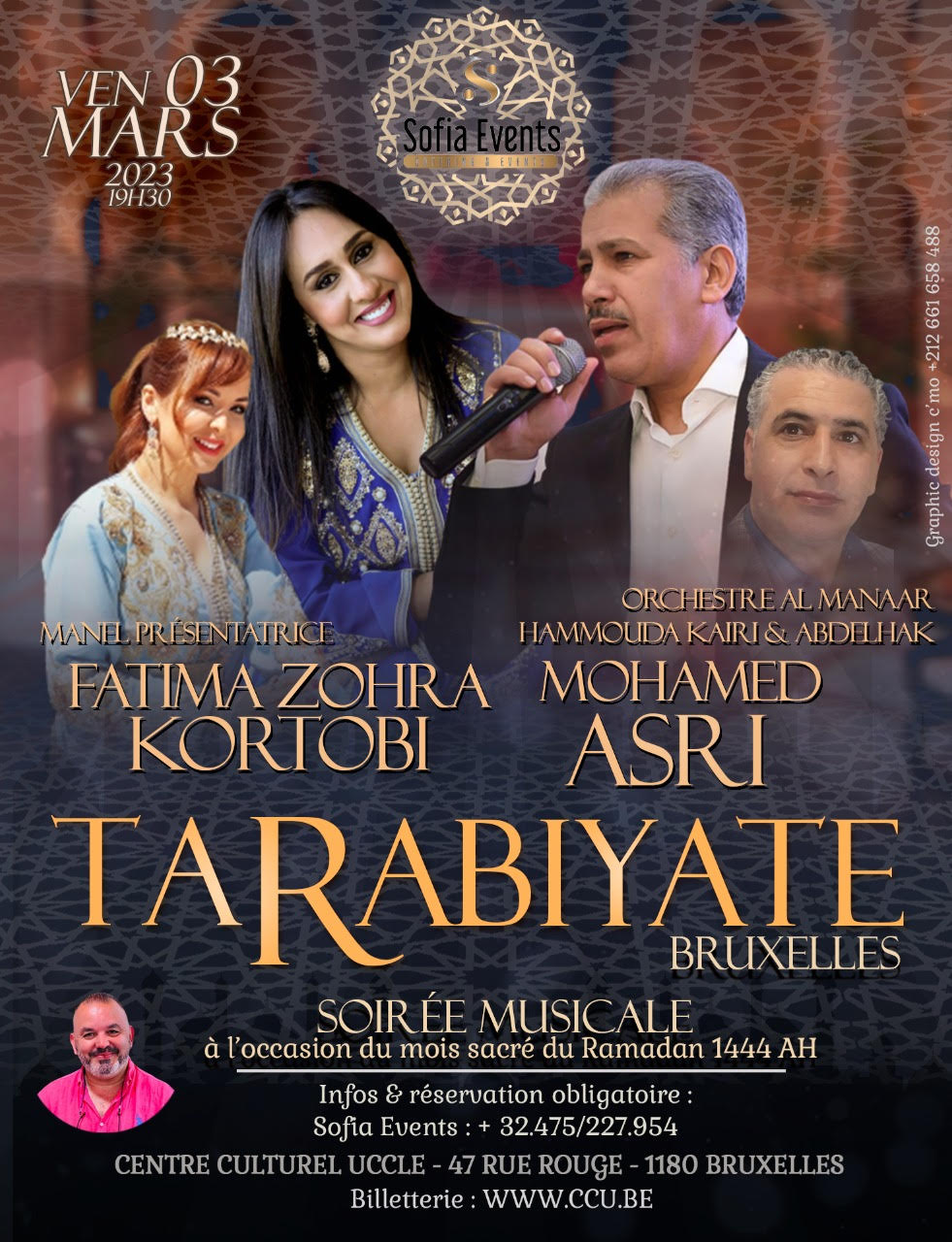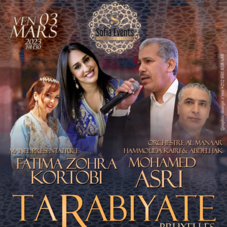 Dans le cadre de ses soirées culturelles et à l’occasion de la Journée Internationale des Droits de la Femme et de l’approche du mois sacré du Ramadan, Sofia Évents organise une belle soirée artistique Andaloussia & Tarabiya avec la participation de deux grands chanteurs venus spécialement du Maroc afin de vous faire (re)découvrir leur plus beau répertoire musical et vous faire vivre des moments spirituels et magiques grâce à leur talent sublime…