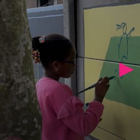Accompagnés lors des ateliers par les artistes Fanny Badaf et Anthea Missy, les jeunes, impliqués dans toutes les étapes du processus, ont aussi eu l’occasion de se réapproprier leur quartier via l’art. Les fresques peuvent être admirées sur les murs de l’école des jeunes de la RUSG, sur le mur du terrain de sport communal et dans les locaux de l’ASBL Le Pas.